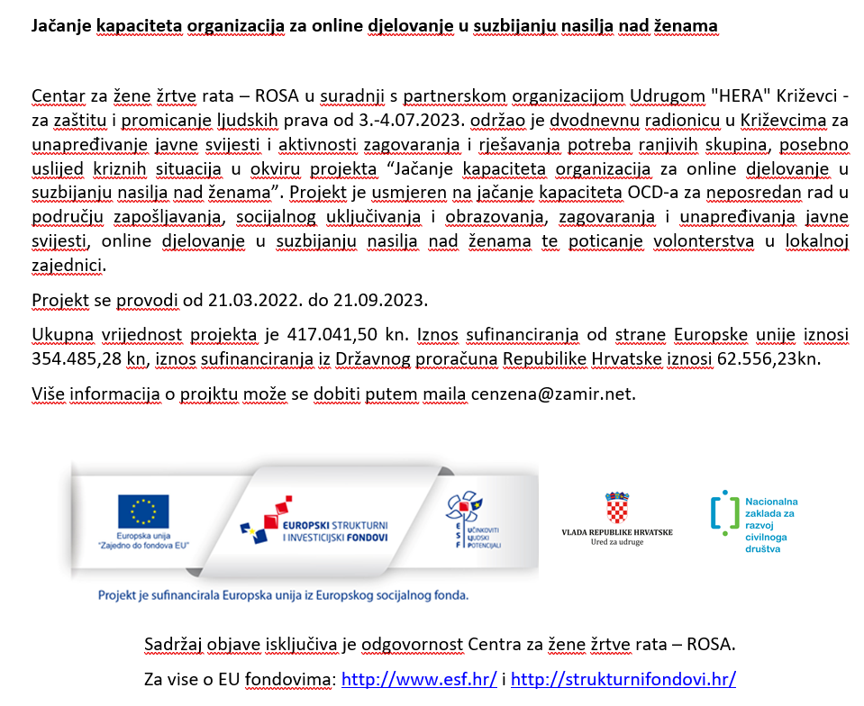 Centar za zene zrtve rata - ROSA u suradnji s partnerskom organizacijom Udrugom "HERA" Krizevci - za zastitu i promicanje ljudskih prava od 3.-4.07.2023. odrzao je dvodnevnu radionicu u Krizevcima za unapredjivanje javne svijesti i aktivnosti zagovaranja i rjesavanja potreba ranjivih skupina, posebno uslijed kriznih situacija u okviru projekta "Jacanje kapaciteta organizacija za online djelovanje u suzbijanju nasilja nad zenama". Projekt je usmjeren na jacanje kapaciteta OCD-a za neposredan rad u podrucju zaposljavanja, socijalnog ukljucivanja i obrazovanja, zagovaranja i unapredjivanja javne svijesti, online djelovanje u suzbijanju nasilja nad zenama te poticanje volonterstva u lokalnoj zajednici.