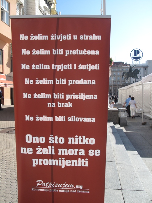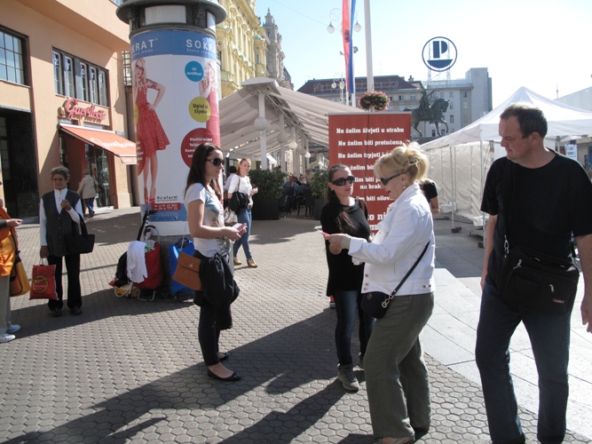 Akcija je organizirana na trgu Bana J. Jelacica i tom prilikom su aktivistice gradjanima i gradjankama dijelile letke kampanje Potpisujem! te s njima razgovarali o Konvenciji i problemu nasilja nad zenama. Akciji su se pridruzile i clanice Centra za zenske studije i Lezbijske grupe Kontra.
