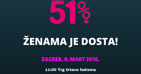 07.03.2016. „ZENAMA JE DOSTA!", sredisnja je poruka ovogodisnje protestne povorke, kojoj ce se pridruziti zene, clanice zenskih organizacija sirom Hrvatske. Zenama je dosta politicke podzastupljenosti i izigravanja vazecih zakona. Dosta nam je istjerivanja s trzista rada, nezaposlenosti, neplacenog, potplacenog ili manje placenog rada i tjeranja natrag u privatnu sferu. Zenama je dosta prebacivanja tereta za obitelj i odgoj djece iskljucivo na ledja zena, bez drustvenih servisa. Dosta nam je prijetnji da ce nam smanjiti stecena prava koja stite nase seksualno i reproduktivno zdravlje i oduzeti kontrolu i pravo odlucivanja o vlastitom tijelu! Zenama je dosta partnerskog i drugih oblika nasilja kojima smo izlozene svakodnevno. Zenama je dosta toga da se nas kaznjava za nasilje koje smo prezivjele. Zenama je dosta zato sto drzava ne poduzima nista da sprijeci femicid.Zahtijevamo primjenu zakona te nacionalnih i medjunarodnih dokumenata i mehanizama kojima se osigurava provedba ustavnog nacela ravnopravnosti spolova i ostvarenje zenskih ljudskih prava.